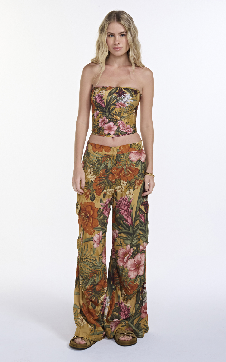 A Calça Cargo Floral une estilo e conforto com toque despojado. Esta calça possui um design amplo, proporcionando um visual versátil, perfeito para diversas ocasiões. A estampa Tropical Vintage combina charme retrô com vivacidade tropical. Um floral que transmite nostalgia, elegância e o toque atemporal do verão com estética vintage. Use da praia à cidade.