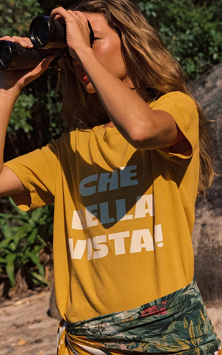 Camiseta estilo t-shirt, com decote canoa e sem cava. Estampa silk localizada, frase "Che Bella Vista".