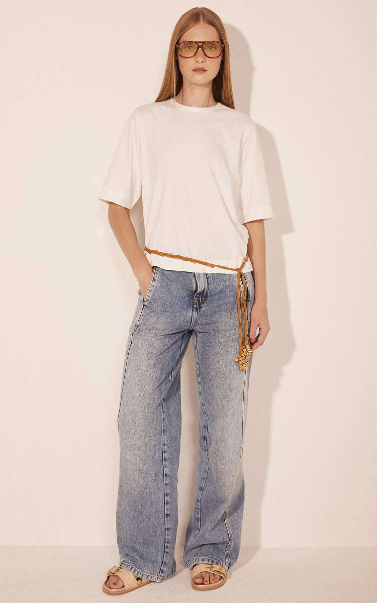 A camiseta Essência, feita em malha de algodão, apresenta gola careca em ribana e mangas curtas, criando um visual confortável e casual. A estampa vazada com tela nas costas e os rebites dourados nos ombros adicionam um toque moderno e sofisticado à peça, tornando-a perfeita para looks descomplicados, mas cheios de estilo.