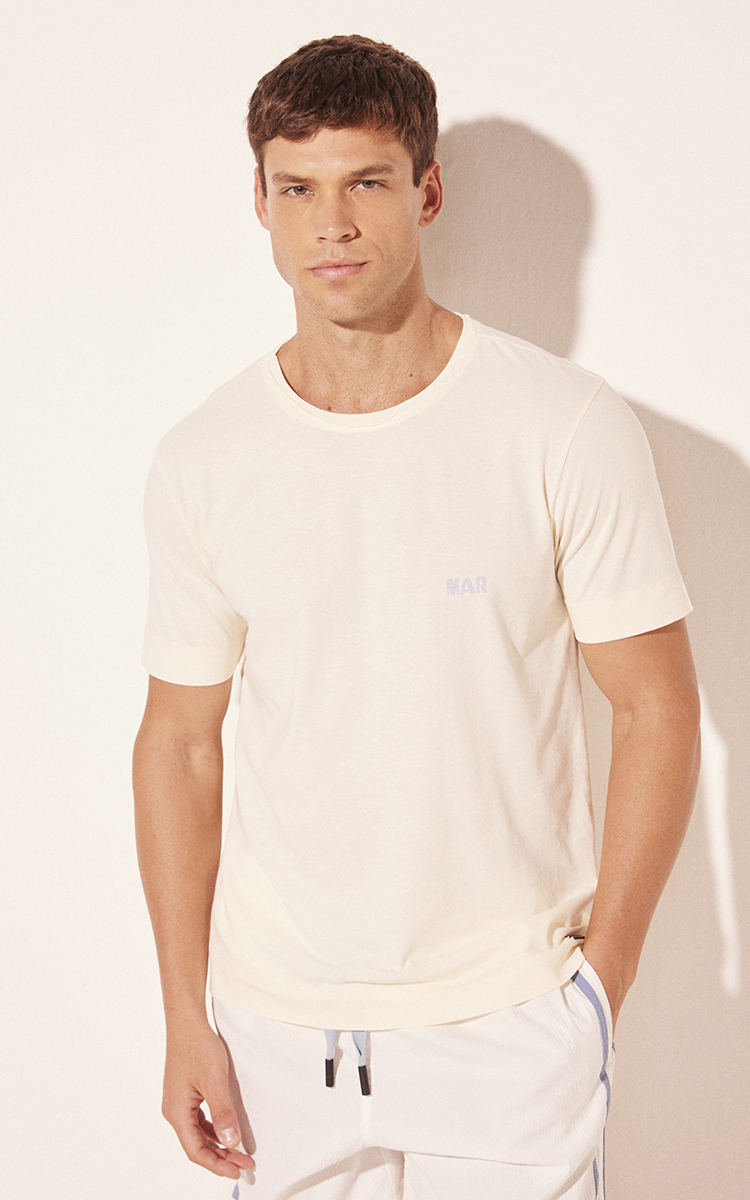 A Camiseta Manga Curta Silcada Marítimo Azul, em malha de algodão, apresenta modelagem clássica com gola careca e lavanderia marmorizada que confere textura e aspecto contemporâneo ao tecido. O silk de barco aplicado nas costas adiciona um toque náutico e sofisticado.