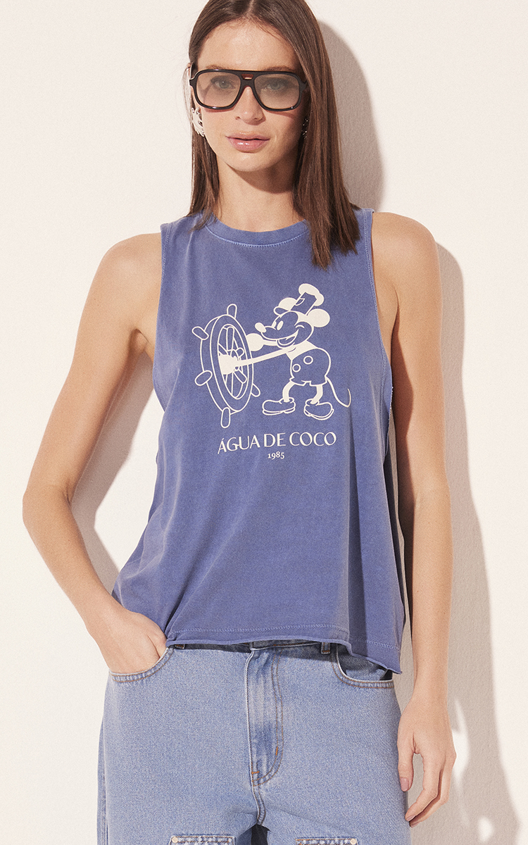 A camiseta regata Âncora, em malha de algodão estonada, traz modelagem relaxed que combina conforto e estilo casual. A gola em ribana e a cava a fio com acabamento em trançadeira reforçam o visual despojado, enquanto a barra larga garante estutura e caimento leve. O silk do Mickey na frente adiciona um toque divertido e nostálgico, traduzindo a essência descontráida e sofisticada da Água de Coco.
