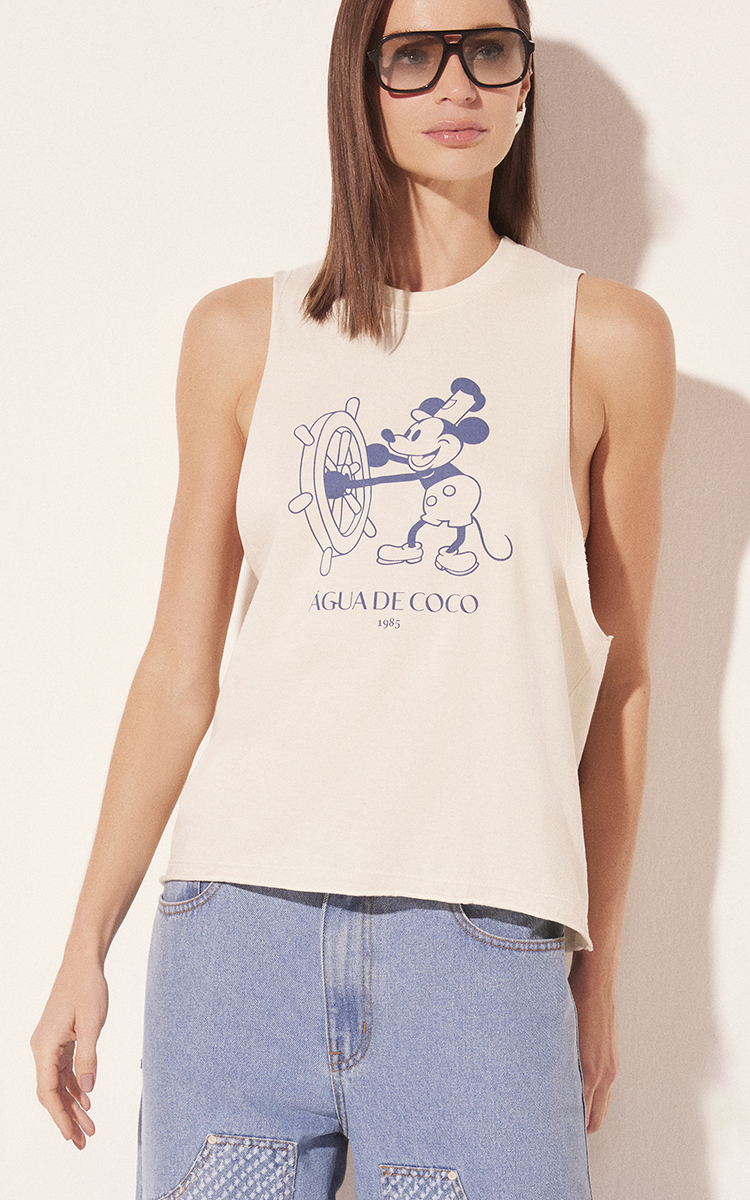 A camiseta regata Âncora, em malha de algodão estonada, traz modelagem relaxed que combina conforto e estilo casual. A gola em ribana e a cava a fio com acabamento em trançadeira reforçam o visual despojado, enquanto a barra larga garante estutura e caimento leve. O silk do Mickey na frente adiciona um toque divertido e nostálgico, traduzindo a essência descontráida e sofisticada da Água de Coco.